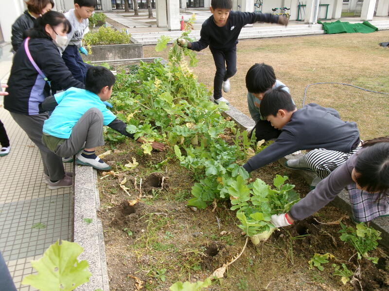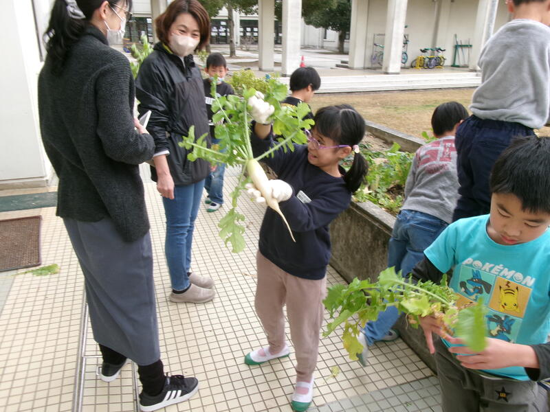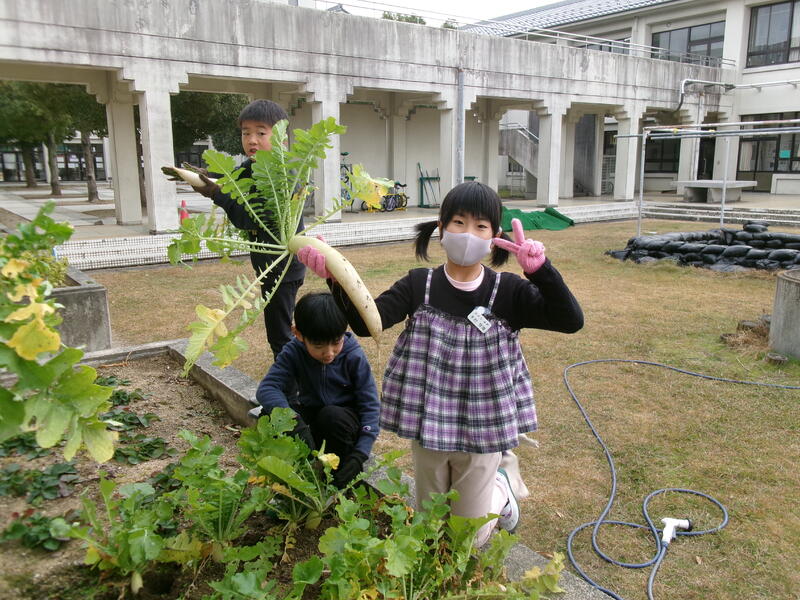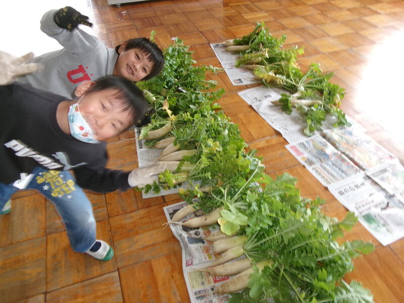 2年生が育てていた大根を収穫しました。みんなのお世話がよかったのか、日当たりがよかったのか、土がよかったのか、たくさん収穫できました。なかにはお店で売っているような立派な大根もありました。子どもたちは大喜びで収穫していました。とっても大事そうに大根を持っている姿が微笑ましかったです。この大根はどうするのでしょうか?楽しみがまた増えました。