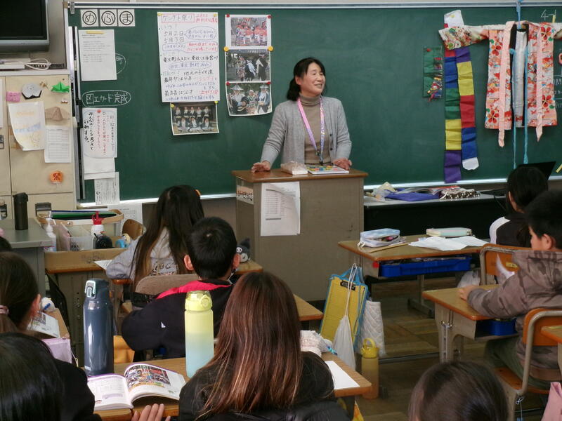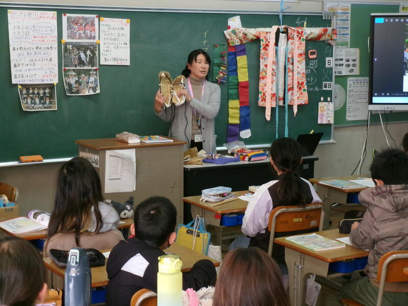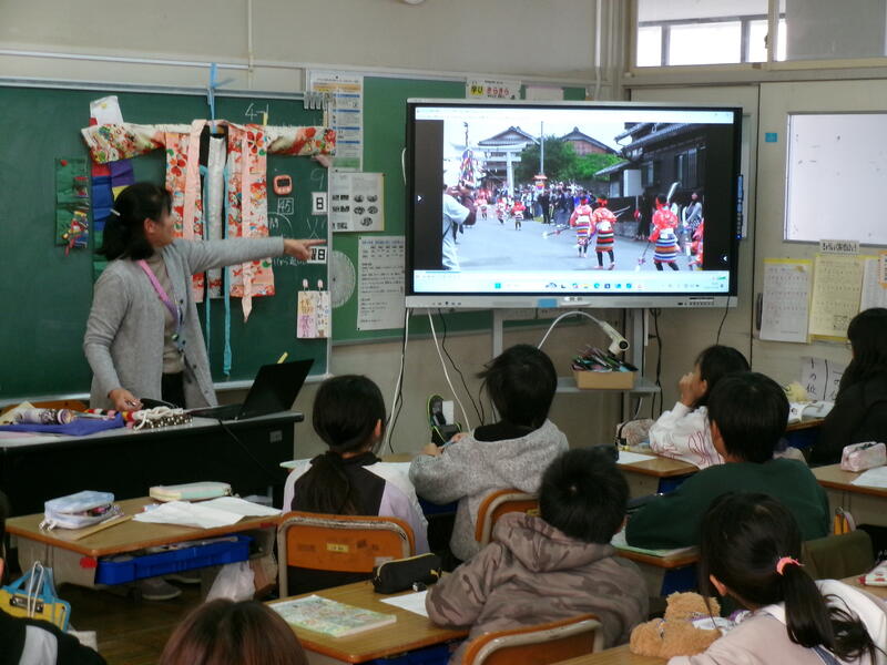 12月9日に4年生がケンケト祭りについて学習しました。教えていただいたのは、山之上在住の支援員の谷村先生です。ご自身の子どもさんの経験も合わせて、どのような祭りか、どのようにして守られてきたかをお話ししていただきました。子どもたちにとって竜王町にある伝統的な行事について学ぶ貴重な機会となりました。きれいな衣装や、勇ましい舞の映像も見せていただき、さらに竜王町のことが好きになったのではないでしょうか。