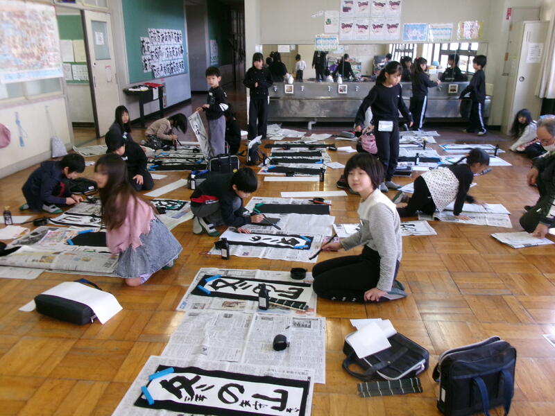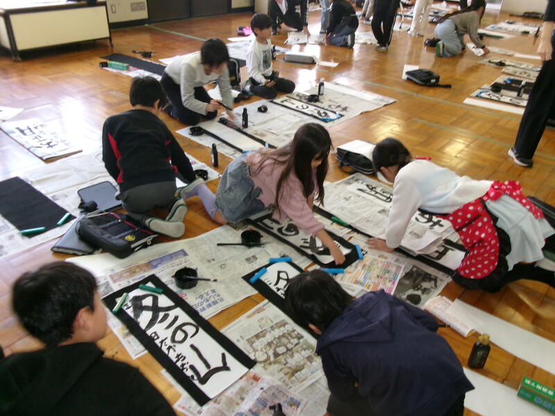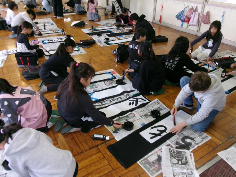 いよいよ2学期の終わりが見えてきて、新年を迎える準備をする時期に来ました。今日は3年生が書き初めに挑戦しました。教室前のホールをいっぱいに使って、普段書いている半紙よりも大きな画仙紙に書き初めをしました。一文字が大きくて、書き慣れていないこともありましたが、3年生らしく元気いっぱいでがんばっていました。作品のできあがりが楽しみです。
