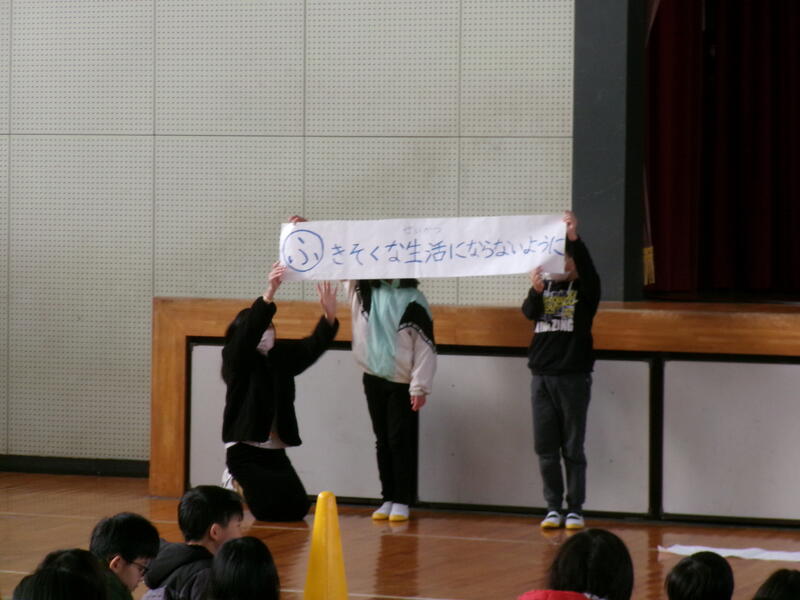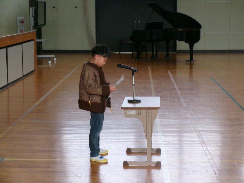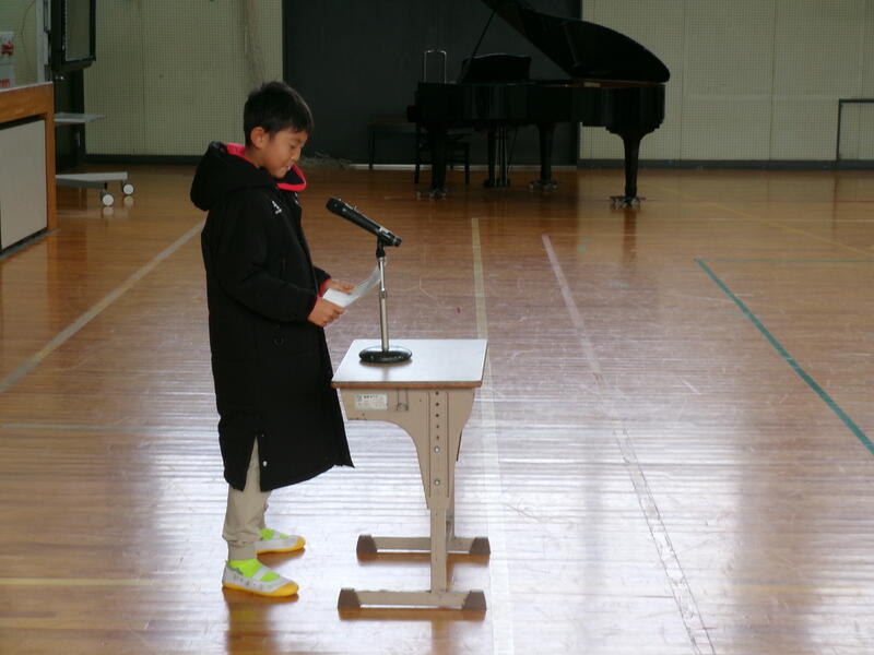 今日で2学期が終了しました。寒い体育館の中、子どもたちは本当にいい態度で最後までがんばりました。私の話の後、ライオンズクラブの方から5年生の平和ポスターの表彰をしていただきました。その後、人権作文や詩・標語で賞をいただいた子どもたちと、県の陸上記録会にでて入賞した子や出場した子どもたちのがんばりをみんなでたたえました。次に、2学期がんばったことの発表を2・5・6年生の代表にしてもらいました。最後は健康員会からの劇仕立てで、冬休みに気をつけることを伝えてもらいました。とってもおもしろくわかりやすい劇で子どもたちの印象に残ったことだと思います。今学期の保護者のみなさま、地域のみなさまのご理解とご協力で無事に終えることができました。本当にありがとうございました。