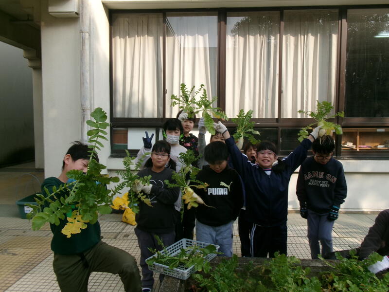 今日、おおぞら・たいようの子どもたちが秋から育てていた大根の収穫を行いました。あまり大きい物ではありませんが、数が多く、ぷっくりしていておいしそうなものばかりでした。とった大根で「おでん」が計画されています。自分たちで育てた物を自分たちで調理する。とっても大切な学習ですね。楽しく学習して、おいしくいただいてほしいと思います。