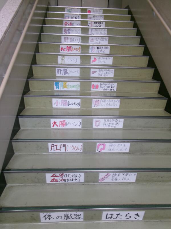 竜王西小学校の階段の掲示物ができています。子どもたちのアイデアで、字で、絵で、楽しい掲示になっています。毎日これを見ながら階段を上り下りしたり、自分たちならこんな事を描きたいと考えてくれたりできるといいと思っています。また、見に来ていただきたいと思います。