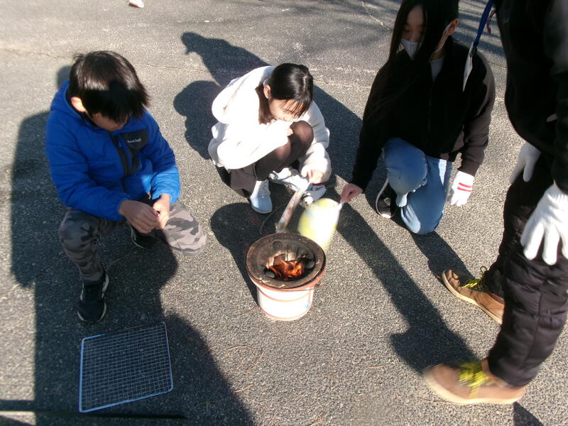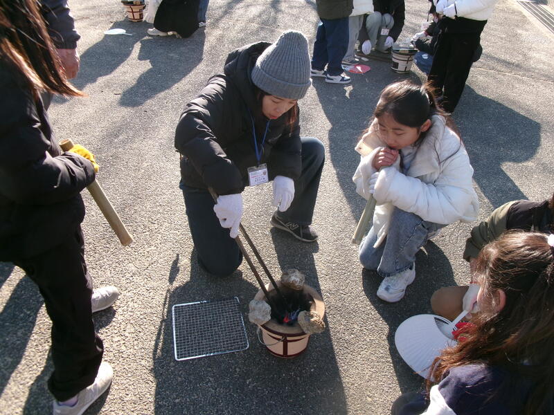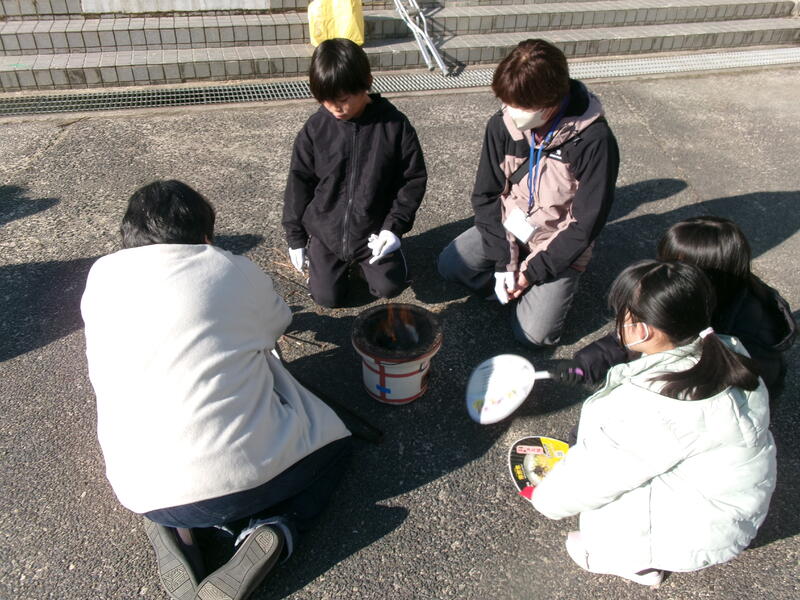 2月に入りました。今日は3年生が社会科の学習で七輪体験をしました。火をおこそうと一生懸命にうちわであおったり、火吹き竹を吹いたりしてがんばりました。火のおこった班から順に網をおいてお餅を焼きました。自分たちで作った火でお餅を焼くと、格別な味だったと思います。少しでも昔の道具のよさや時間がかかることを体験し、現代の道具の素晴らしさを感じてくれたことと思います。