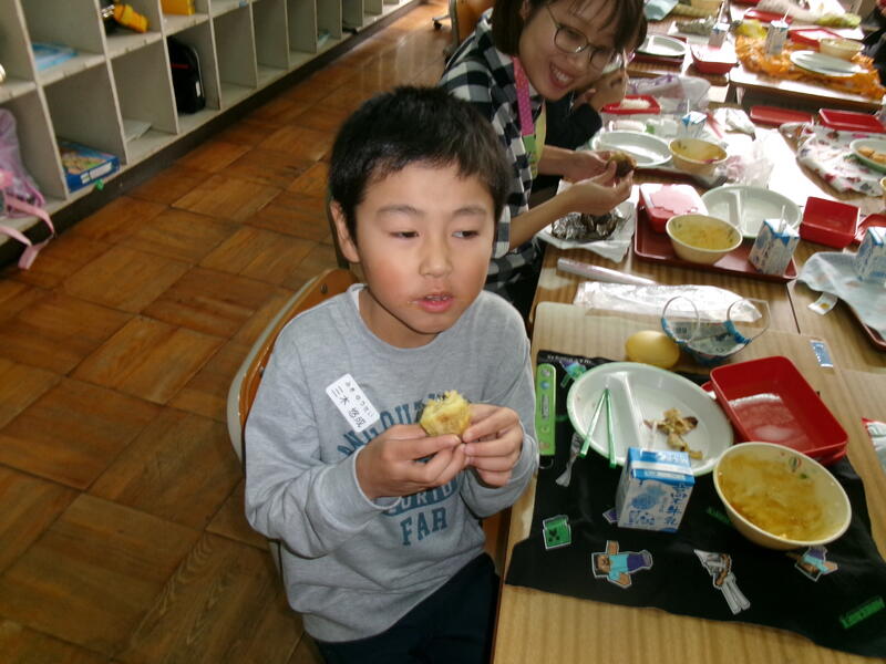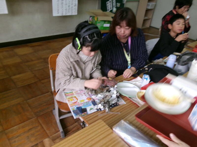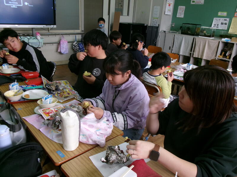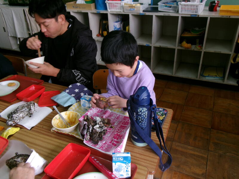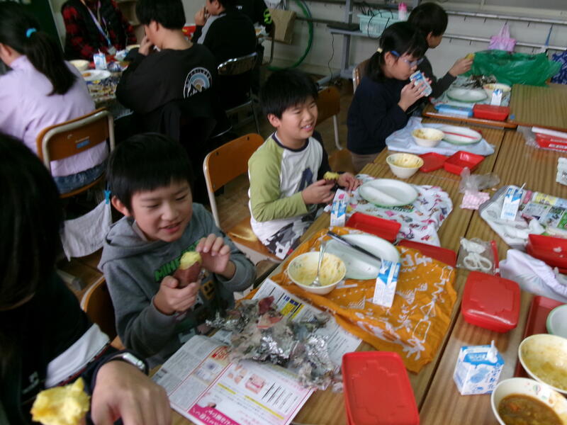 今日は、おおぞら・たいようのお友達が午前に、2年生が午後に焼きいもをしました。出張があり、午前中の様子しか見られませんでしたが、みんなで集まって給食と焼きいもを食べるところにお邪魔しました。いつもより早く給食を食べ、おいしそうな顔でおいもを食べていました。とってもほっこりした時間を過ごすことができました。「校長先生もどうぞ」といわれて、お言葉に甘えていただきました。みなさんごちそうさまでした。とってもおいしかったです。