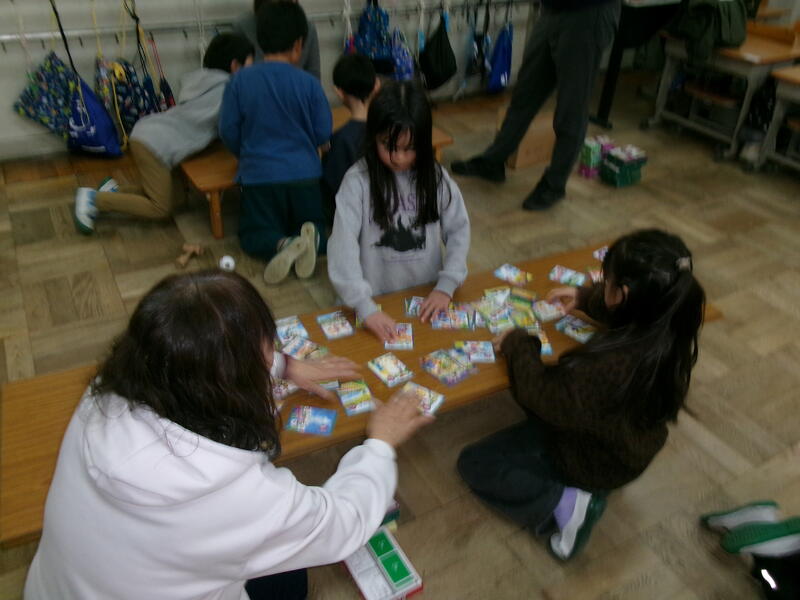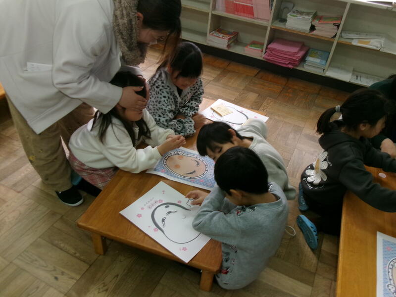 今日は1年生がお正月遊びを体験しました。福笑い・カルタ・こま回しなどたくさんのボランティアのみなさんと一緒に楽しく遊びを満喫することができました。福笑いのひょっとこって初めて出会ったのではないでしょうか。こま回しはとても上手に回し、手で受けられる子もいました。家ではなかなかやらない遊びでも、学校でみんなとなら楽しく遊べます。本当にいい経験をさせてもらいました。ありがとうございました。